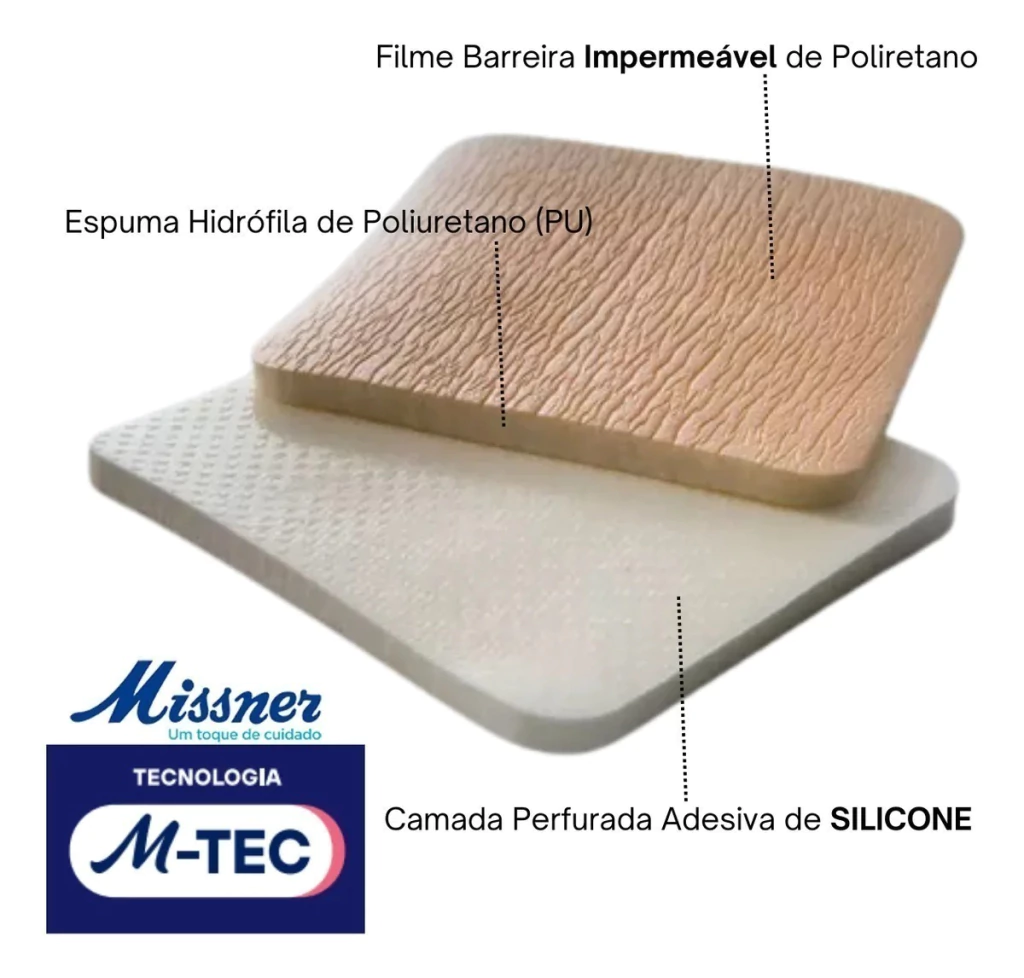 M-Tec Missner Espuma de Silicone Absorvente proporciona um ambiente úmido recomendável para a cicatrização da ferida e reduz o risco de maceração da pele.