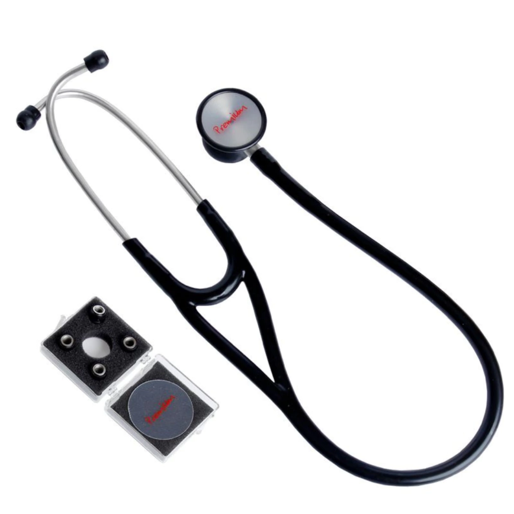 O Estetoscópio Cardiológico Premium possui um design avançado, diafragma de alta sensibilidade e auscultador em aço inox para ausculta mais precisa.