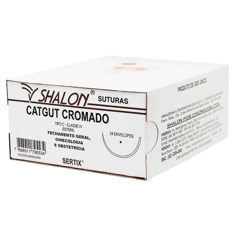Contém sutura de Catgut Cromado. estéril e absorvível, composta de tecido conjuntivo purificado de animal, cortada em fitas uniformes, tratadas de forma mecânica, física e química, convertendo-se em fios de coloração marrom. Sua absorção ocorre de 60 a 90 dias. A sutura acompanha uma agulha cirúrgica cilíndrica em aço inox.